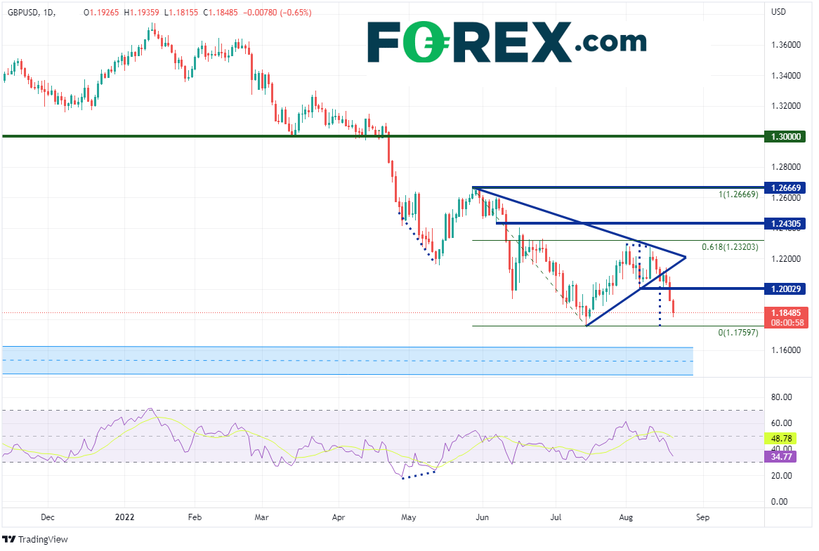 英镑/美元在2021年6月创下1.4250高点后开始下跌,于4月大举下破1.3000的心理整数关口,低至1.2155,后因RSI和价格背离而回升至1.2660。该货币对之后走出对称三角形,该形态被视为延续形态。价格逼近形态尖端的过程中形成双顶,并于8月15日在1.2100附近下破对称三角形。几天后的8月18日,价格下破双顶形态的颈线1.2003。双顶形态突破后的目标为突破位加上形态高度,本例中在7月14日低点1.7587附近。但最新揭晓的、积极零售销售数据不足以压制生机勃勃的美元多头,英镑/美元因此跌至7月15日以来最低点。