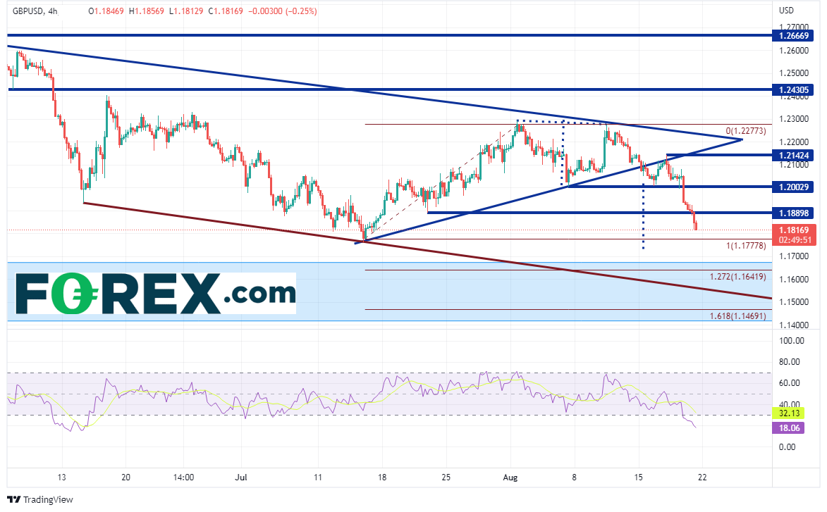 英镑/美元4小时图大举下破1.2003,下方第一支撑位在遥远的7月14日低点1.1760,然后是2020年3月疫情低点以来的宽广区间,其上轨落在1.1675。如果失守,可能下看7月14日低点到8月1日高点行情的127.2%扩展位1.1642,然后下看1月14日以来的下降趋势线所在的1.1560附近。但请注意,RSI处于超卖状态,暗示价格可能蓄势展开短线修正。第一阻力在7月21日低点拉出的水平阻力位1.1890,然后是上文提到的1.2003,如果攻克,有望摸至1.2152。