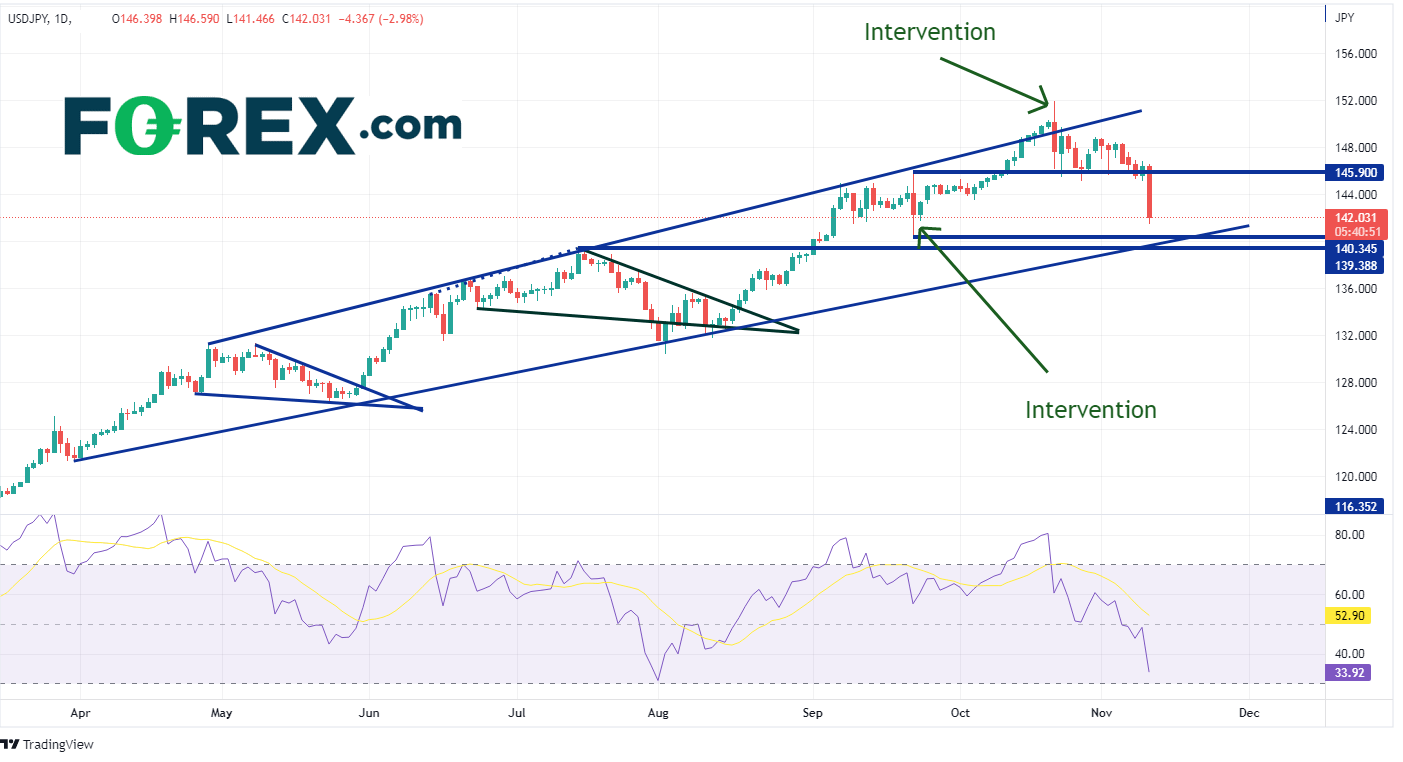 在日线图,美元/日元由于出现了与往常相比的巨大抛售,已经回落。日本于9月22日首次干预外汇市场,当时市场仅下跌了175个点,跌幅为1.22%。10月21日,财政部再次干预外汇市场,这次将美元/日元压低了250个点,跌幅为1.65%。 如果当前的抛售持续下去,它将比干预能更有效地加强日元。今天,该货币对下跌了464个点,跌幅为3.18%(截至撰写本文时)。有一个三重支撑分别在9月22日低点140.35附近,长期上行通道的下沿139.80附近,以及7月15日高点139.39。阻力位在10月27日低点145.10。