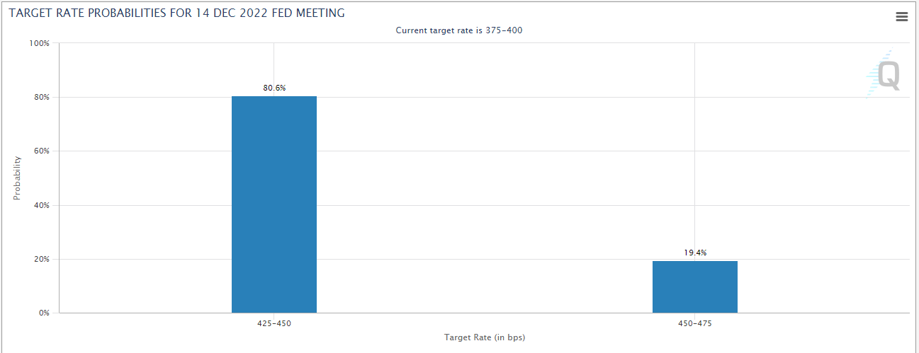 现在市场注意力转移到了美联储,降低的通胀率是否给美联储12月“只”加息50个基点打开绿灯?6月以来,CPI同比增速节节下滑,从9.1%、8.5%降至8.3%和8.2%,如今直接跳至7.7%。同时联邦基金费率从2022年初的0.00%/0.25%升至目前的3.75%/4.00%。那这是否意味着美联储激进加息的措施开始起效?美联储在FOMC会议声明中强调:“在决定加息步伐时,委员会将考虑货币政策的累计紧缩、政策对经济活动和通货膨胀的滞后影响以及经济和金融进展”。市场因此认为,美联储希望放缓加息速度,来观察此前加息是否开始发挥影响经济的效果。在会后的新闻发布会上,美联储主席鲍威尔则指出:“把利率提高到多高水平比货币政策收紧步伐更重要。”换言之,最终利率水平比FOMC加息幅度是50个基点还是75个基点更重要。结合今天公布的通胀数据来看,美联储很可能在12月加息50个基点。根据芝商所“FedWatch”工具,在CPI公布后,市场认为12月加息50个基点的概率暴涨至80%!