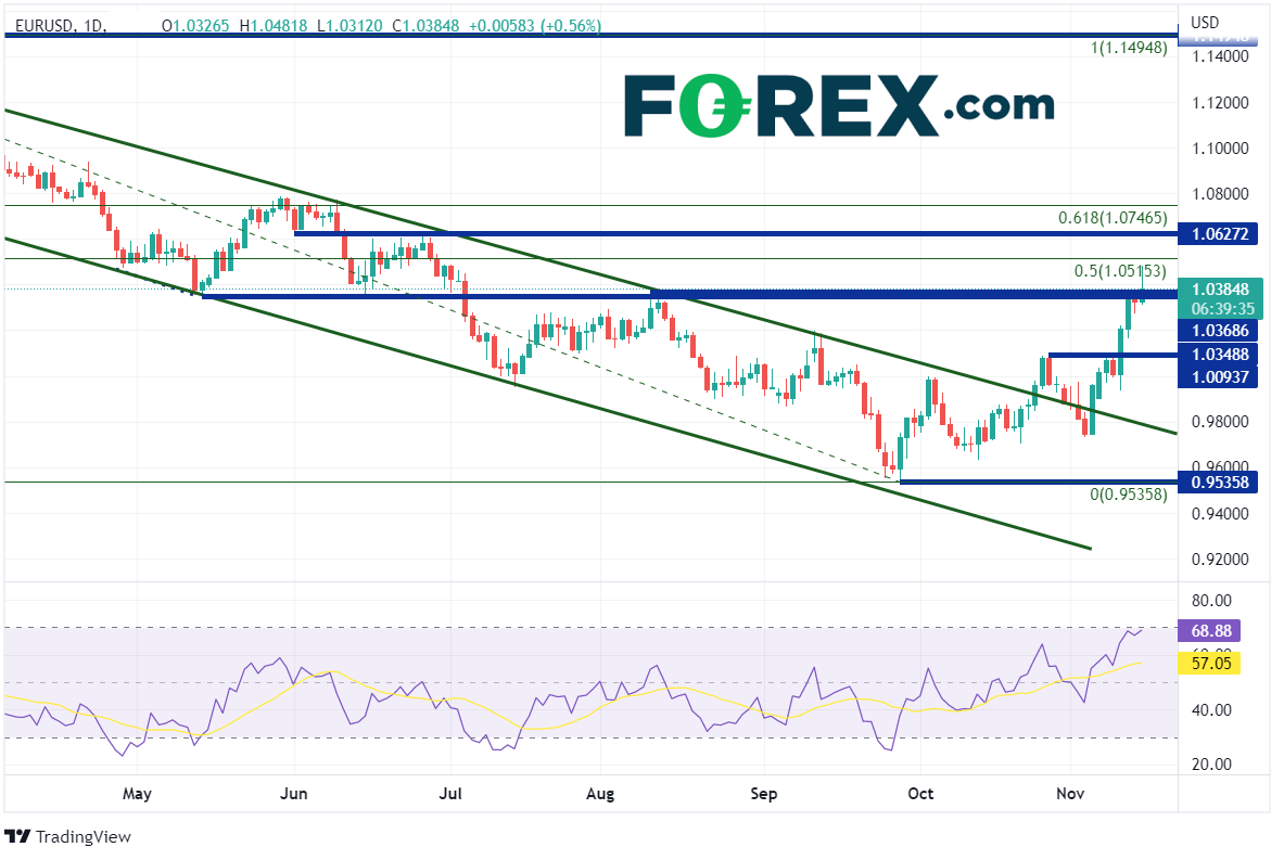 欧元/美元自2月达到年初至今高点1.1495后,沿着下行通道稳步下跌。9月28日,该货币对下探至0.9536,测试下行通道下轨。随后该货币对在10月25日反弹,冲破通道上轨的0.9975附近区域。欧元/美元击穿1.0350/70附近的强势阻力位,日内最高点上探至1.0482。