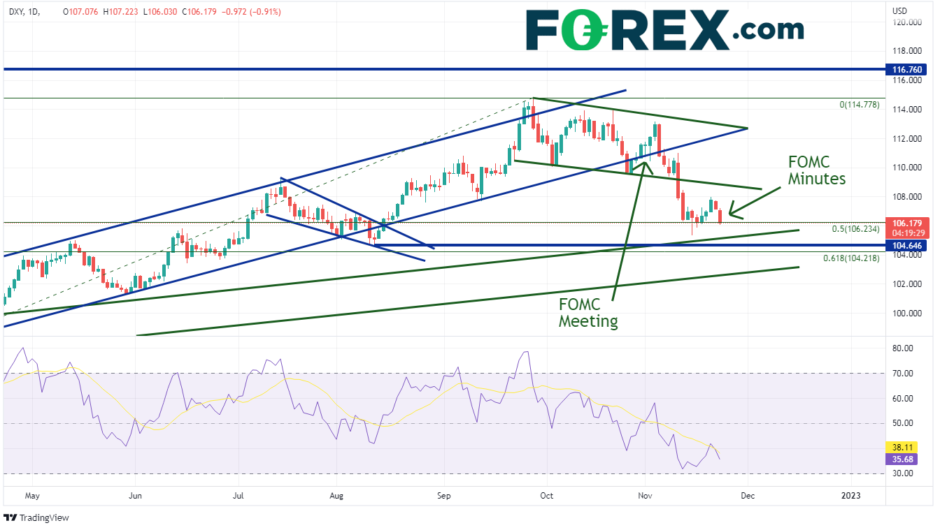 美元指数会继续走低吗?根据今天的FOMC会议纪要,美联储似乎希望12月的加息幅度小于11月。然而,会议纪要还显示,委员会成员认为峰值利率应高于之前的水平。如果美联储在12月会议上小幅加息50个基点,美元指数的走势应该会依照前瞻指引(点阵图)而不是加息行为本身!