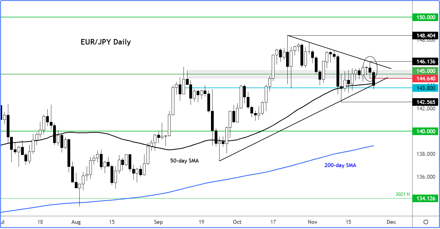 周三欧元/日元的日线图形成看跌吞噬K线,今日跟进下行走势。随着汇率测试到支撑位和看涨趋势形成的三角形形态,下跌在143.80附近暂歇。
