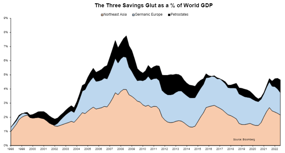 整个东北亚,尤其是中国,采取了重商主义、抑制内需和积累储备资产的政策。这些政策的原因很复杂(我可以想到人口统计学、儒家价值观和对国际货币基金组织的担忧)且不在本文讨论范围内,但结果显而易见:中国、日本和韩国的经常账户盈余占全球GDP的比重从1998年的1%上升到2008年的 4%。