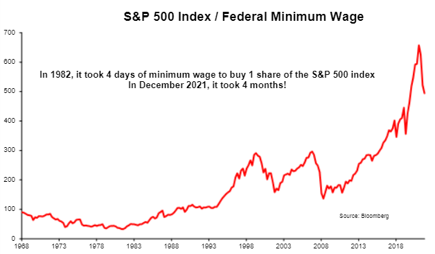 其次,金融资产的价值相当于它们未来的现金流,折现到现在。这个贴现率越低,股票、债券和房屋的价值就越高。 当通胀率低时,工资缓慢上涨,因此以劳动力计算的金融资产成本上升:1982 年婴儿潮一代成年时,四天的最低工资就可以购买一股标普 500 指数股。40 年来不断下降的利率推高了价格,如今购买一股标普 500 指数股则需要四个月的最低工资。低通胀和低利率有利于那些拥有大量资产的人(老年人),但损害了那些主要资源是劳动力的人(年轻人)的利益。