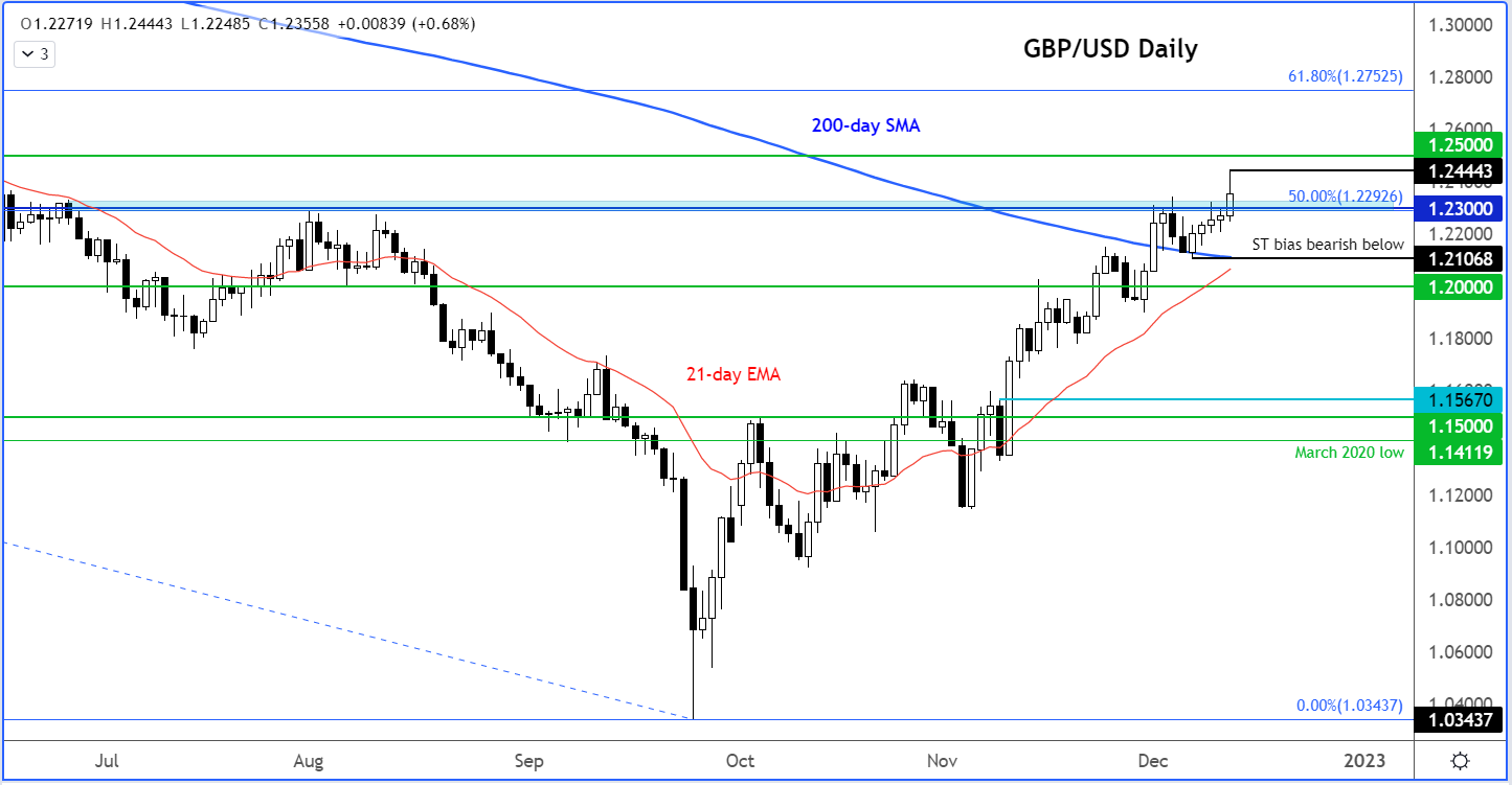 在上次会议里,英国央行将利率上调75个基点,但警告称,由于当前的经济衰退可能持续长达2年,最终利率将低于市场预期。不过截至周二,英镑反弹至1.24美元上方,当天远弱于预期的美国通胀报告导致美元和美债收益率暴跌。