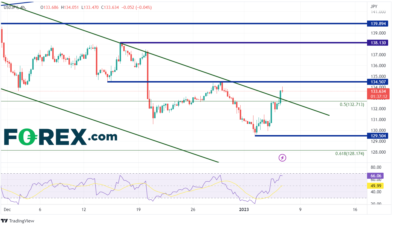 从4小时图来看,美元/日元逐步靠近此前支撑位,即12月28日高点134.50,并在此位置形成第一阻力位。由此向上,货币对可升至200天移动均线136.40(见日线图),随后抵达12月15日高点138.13。一旦突破长期通道未能成功,美元/日元或会在假突破后回撤。第一支撑位落在通道上轨132.70附近。由此向下,交投价或会跌至1月2日低点129.67,最后在2022年年度低点至高点之间61.8%回档位128.17附近找到支撑位。