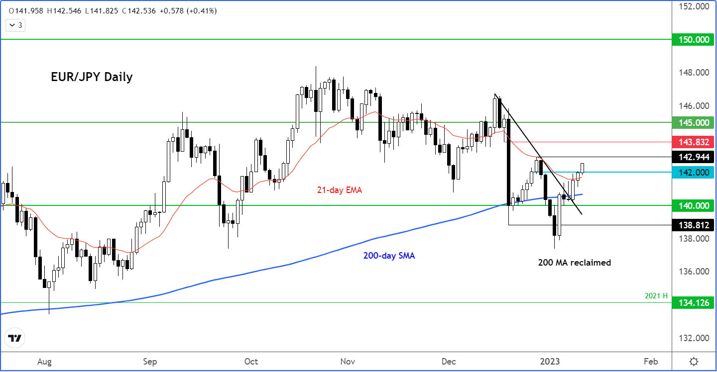 欧元/日元在收复200天简单平均线和21天指数平均线后,最近几天一直在攀升。它在新一轮涨势中升至142.00阻力位上方。我们现在需要看到142.95之上形成更高的高点才能进一步确认走势。
