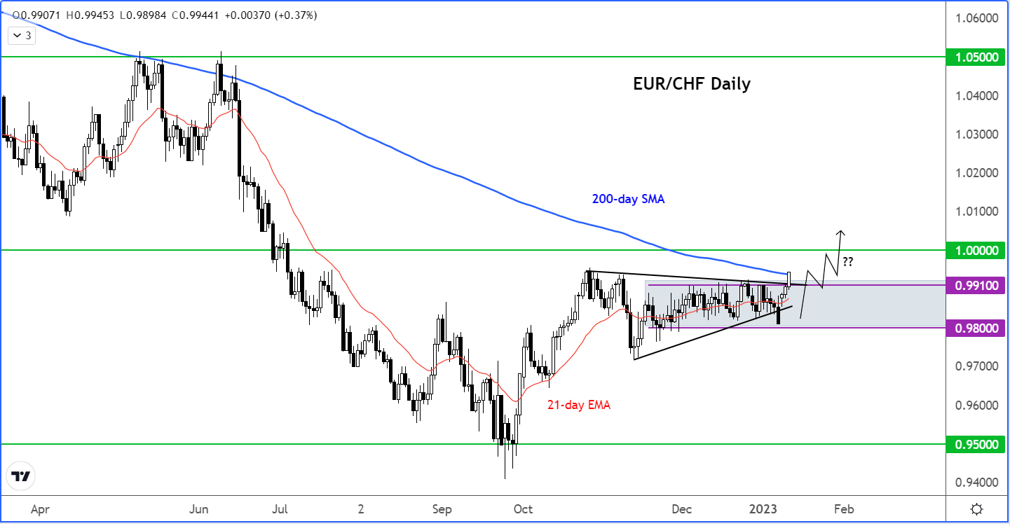 自11月中旬以来,欧元/瑞郎一直困在非常狭窄的区间内,0.9900-0.9910区域施加阻力,0.9800-0.9810区域提供持续支撑。盘整导致去年的跌势完全终止。21天指数平均值已开始走高,200天平均值仍下行,但已大大缩小与现价的差距。鉴于欧洲央行仍保持鹰派立场,欧洲数据略有改善,能源危机没有发生,欧元的一些下行风险已经减少。因此,本次向上突破可能会延续,如果的确如此,我们可能会看到该货币对出现强势复苏。