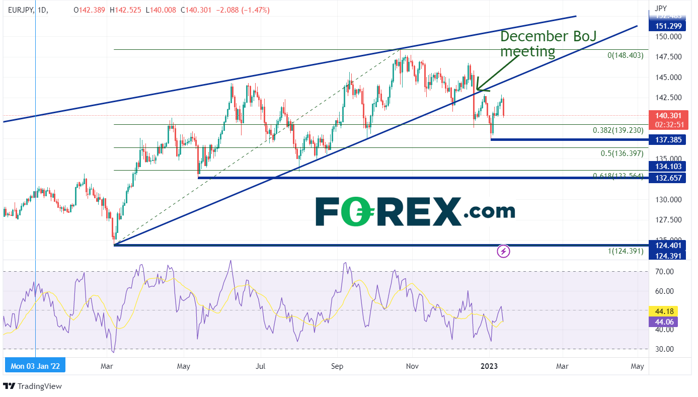 然而,日元不仅是兑美元上涨。欧元/日元也下跌了200多点。在2022年的大部分时间里呈上升楔形走高后,该货币对创下2014年以来的最高点148.40。然而,在上次日本央行会议当天,欧元/日元跌破楔形底部趋势线,回撤至2022年低点至2022年高点区间的38.2%斐波那契回撤位139.23。不过价格随后从该点位反弹,现在又再次接近该点位。下方的支撑位在1月3日的低点137.38,然后是上述区间的50%回撤位136.40。