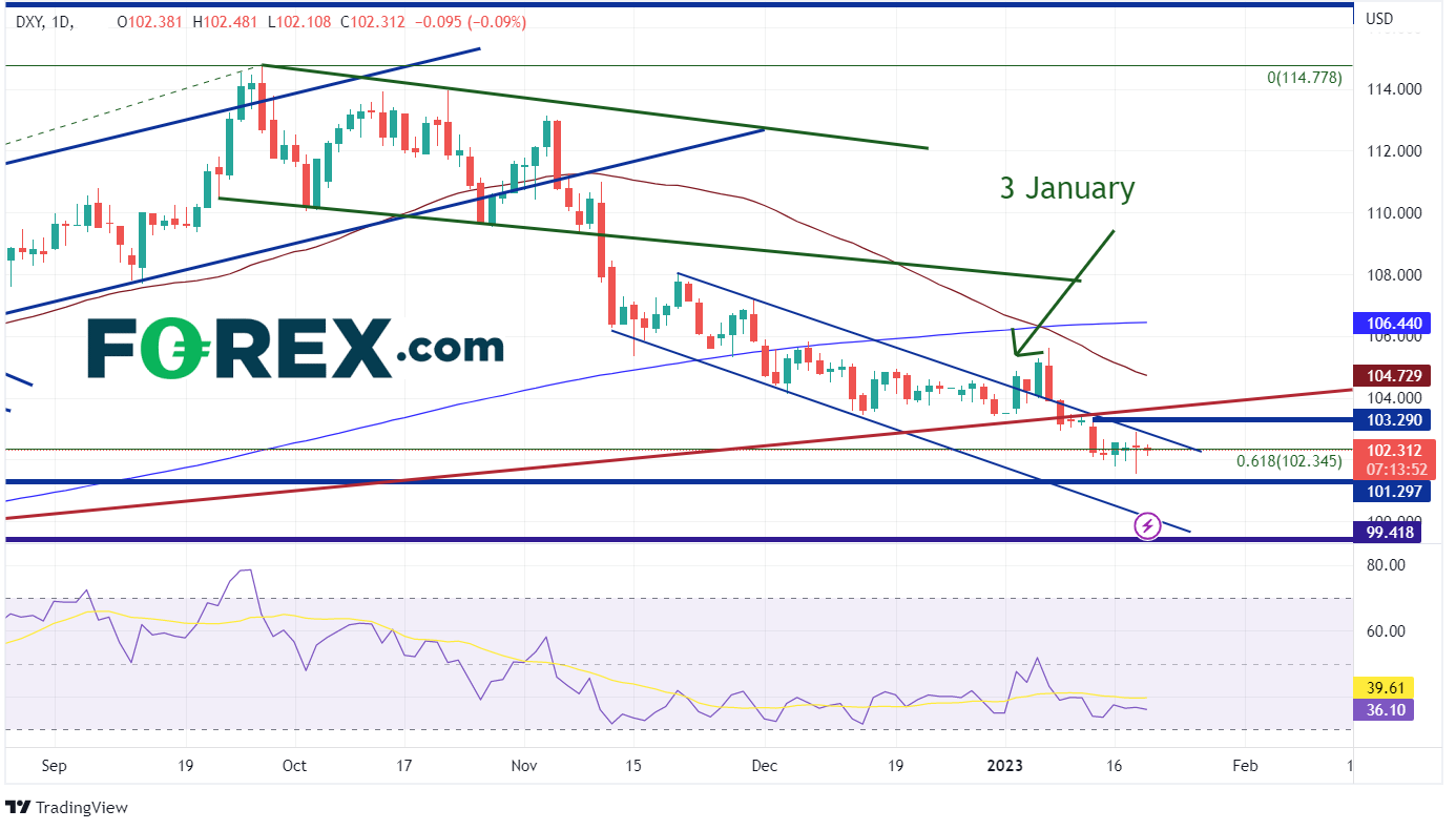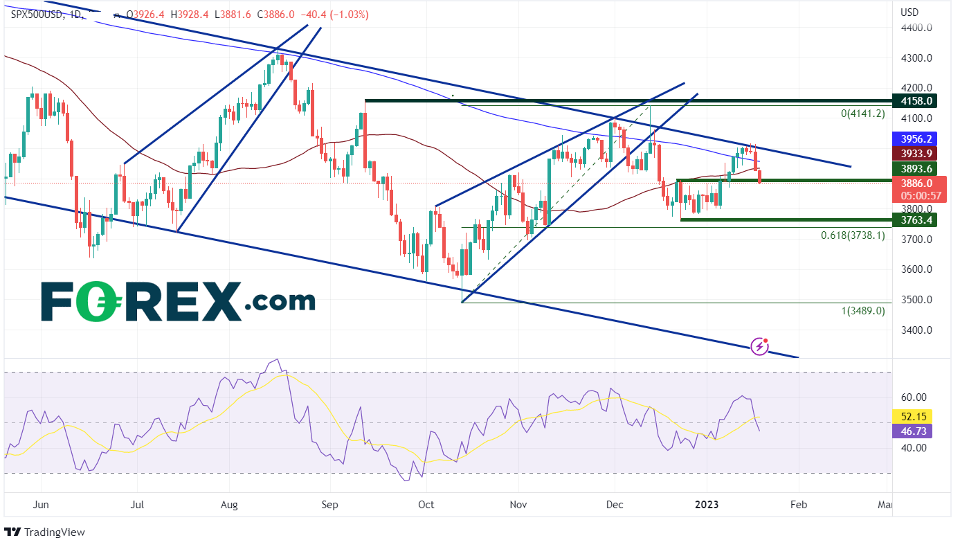 过去几天,大盘股指数标普500指数受逊于预期的数据影响表现惨淡,在2022年1月初的趋势线下方徘徊。昨日,标普500甚至向下击穿200天移动均线和50天移动均线。今日各项数据公布后,标普500指数跌穿水平支撑位3898.6。这可能打开进一步下跌空间,标普500有可能下探2022年12月22日低点3763.4和61.8%斐波那契回档位3738.1(2022年10月13日低点至12月13日高点)。由此向下,指数价格甚至可能一路跌至2022年10月13日低点3489。