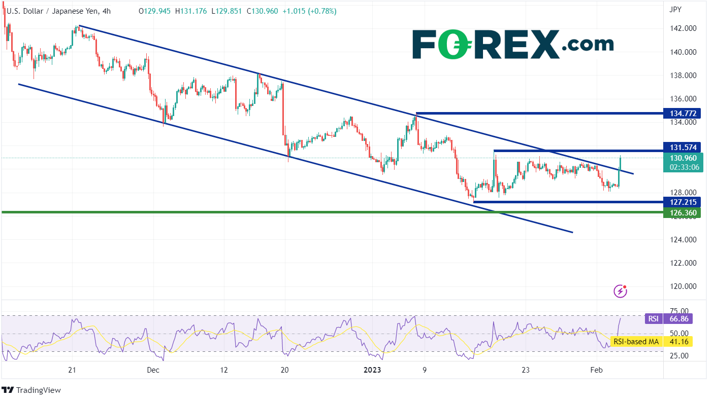 然而,在240分钟图上,美元/日元已经形成了更窄的下行通道。今天,在非农数据发布后,该货币对突破了通道顶部趋势线130.00附近。第一阻力位在1月17日的高点131.57附近。在此之上,该货币对可能移动到50日移动平均线132.78(见日线图),然后是1月6日的高点134.77。但是,如果此举被视为“超买”并且空头入场,美元/日元可能会走低。第一支撑位在前面提到的趋势线130.00附近,然后是2月2日以来的低点128.02。低于该点位,价格可能会跌至年初至今的低点,即1月6日创下的127.22。