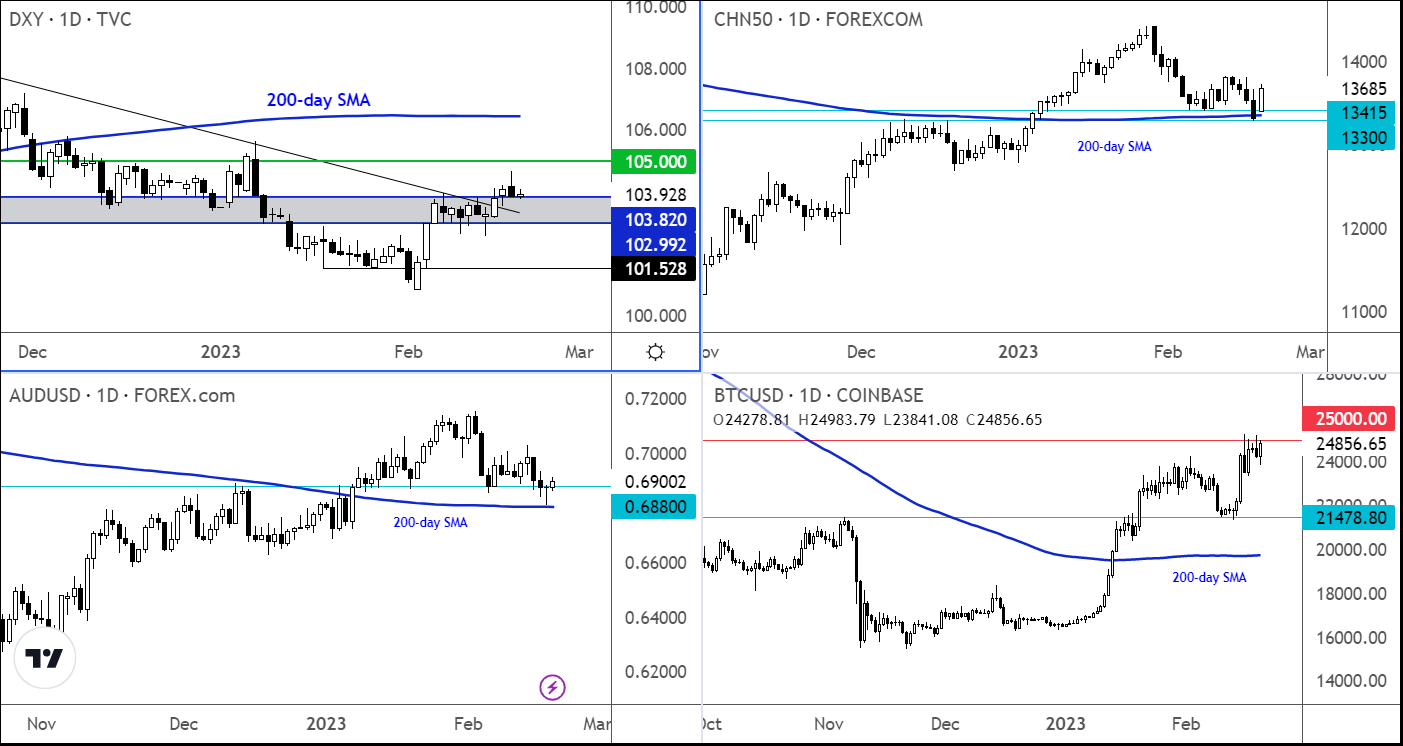 尽管中国市场一夜之间表现转好,且加密货币延续了最近的良好走势,比特币接近2.5万美元, 然而新的一周开局可以说并不令人鼓舞。外汇市场的风险偏好也有所进展,澳元领涨,此前美元回落并于周五收低。不过尽管周五收低,美元指数仍是连续第三周上涨。考虑到所有因素,投资者情绪在本周关键事件之前继续略获支持,但对进一步加息和更长时间收紧货币政策的预期不断上升,这限制了风险资产的整体上行空间。这也可能在周五遭到抛售后为美元提供新的支撑。