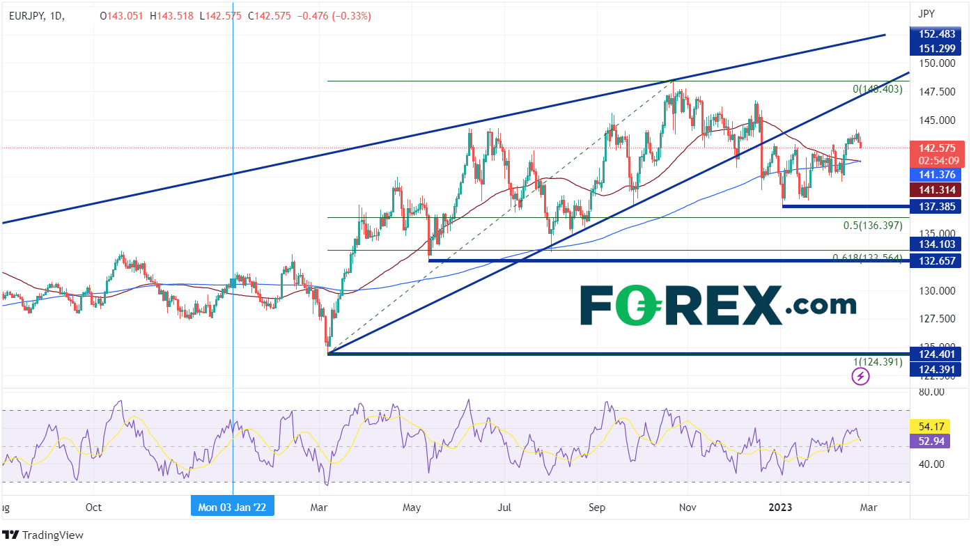 在240分钟图上,可以看出143.00一直是重要的点位,因为它近期既是阻力位又是支撑位。如果价格在周五事件后继续走低,第一个支撑位在141.31和141.38之间的50日和200日移动平均线交汇处(见日线图)。跌破该区域,价格可能会跌至2月13日以来的低点141.52,然后是2月10日的低点139.55。然而,如果CPI走弱或植田比预期“更鸽派”,欧元/日元可能会走高。第一阻力位是2月21日创下的2023年高点144.16。在此之上,价格可能会移动到2022年12月20日高点145.83,然后是2022年12月15日高点146.72。