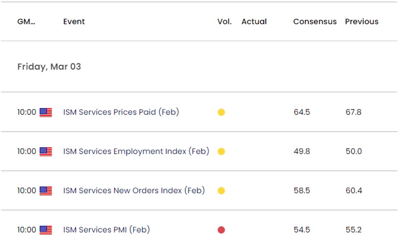 预计此次新发布的数据将显示ISM指数从1月份的55.2收窄至54.5,而低迷的前景可能会令美元/日元跌破移动平均线,因为它会对美联储结束加息周期的决定带来压力。