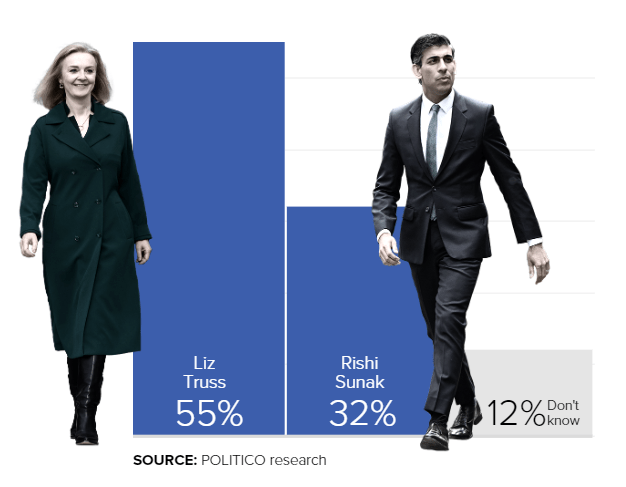 此文发稿时,Liz Truss似乎是早期民调中显而易见的热门。POLITICO的民调显示,Truss拥有55%的支持率而Sunak的支持率为32%(另有12%属于摇摆派)。Opinium最近的民调显示,Truss在坚定投票者中拥有61:39的优势。Sunak仍有机会在未来数周缩小差距,但目前Truss拥有绝对优势。