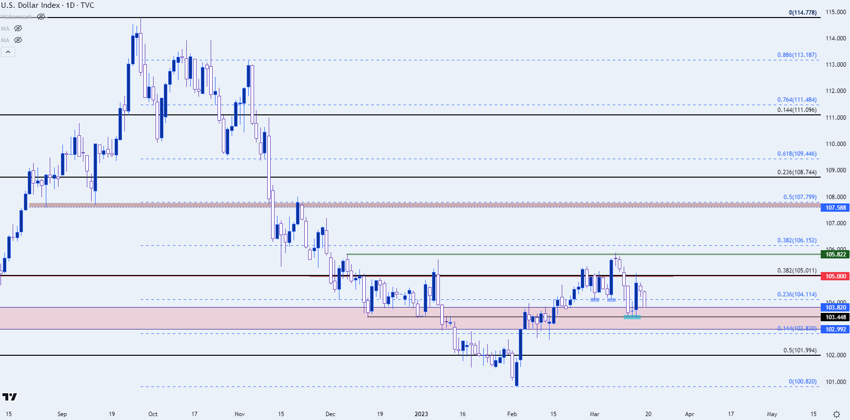 随着加息预期的缩减,美元也在下跌。上周支撑位又落在熟悉的103.45水平,导致周三价格反弹,重新测试105水平。然而进入周末前,周四和周五回调又抹除了前一日大部分上涨。