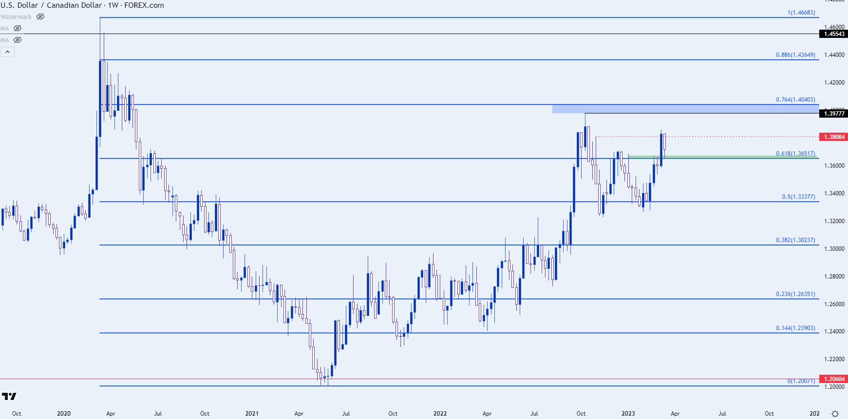 美元/加元的下一个阻力区域值得重点关注,该区域在1.4000心理点位附近,从2022年高点1.3970一直到1.4040斐波那契点位。