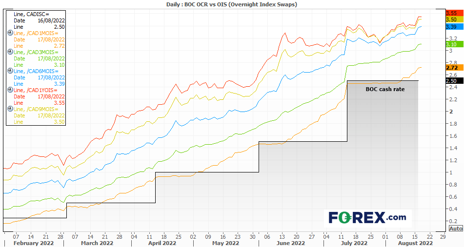 加拿大1个月期OIS预估,加拿大央行在9月召开的下次会议,有88%左右的几率加息25个基点,至2.75%。3个月期OIS已计入12月会议终了前基准利率上升至3%的前景,而9个月期OIS完全计入了基准利率在2023年年中之前达到3.5%的前景。而我现在怀疑,这样的力度是否足以应对可能比预期更加棘手的通胀状况。加拿大央行副行长或许感同身受,认为通胀还是“太高了”。