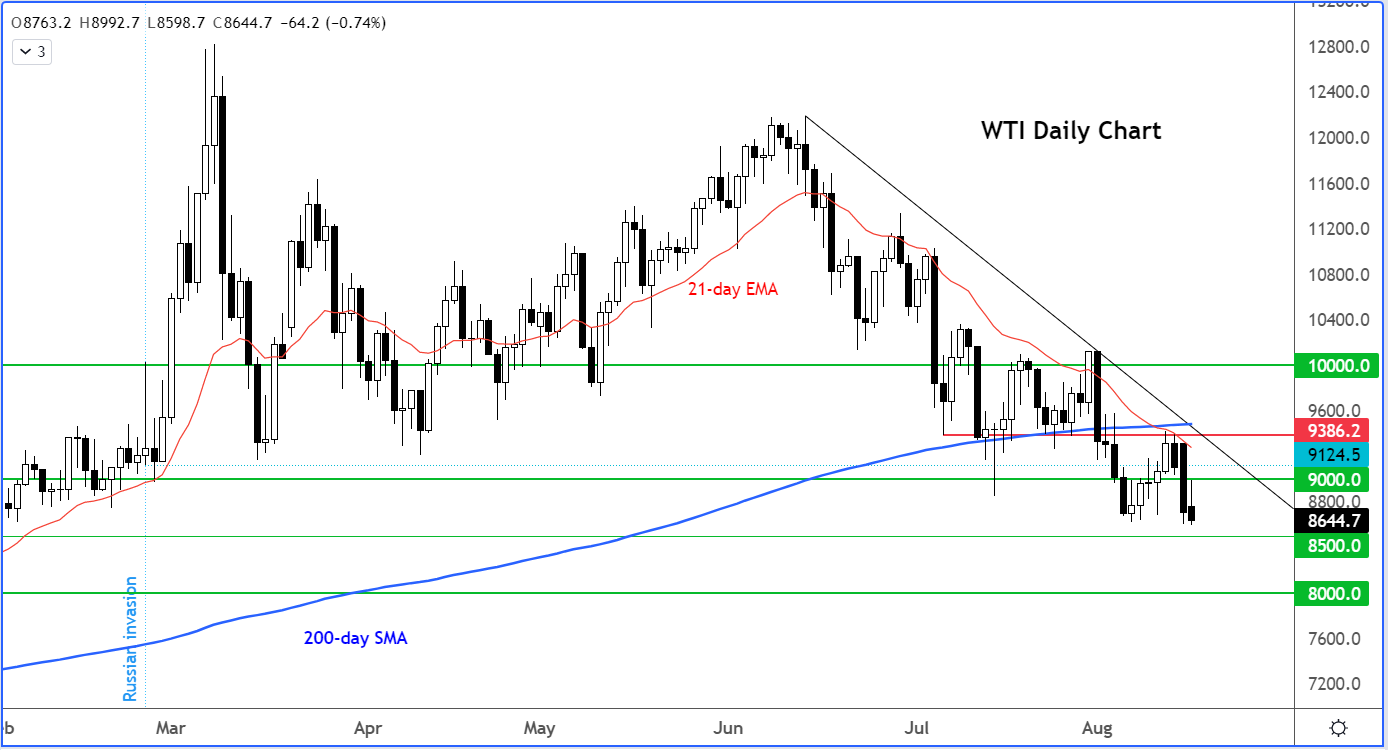 油价短暂休整后再度下跌,后市或最终下破86.50支撑位并跌至85.00。但因为能源危机和市场供应不足,油价的下行空间可能有限。我们认为,如果跌至80,西得州原油可能在该位迎来逢低买盘。