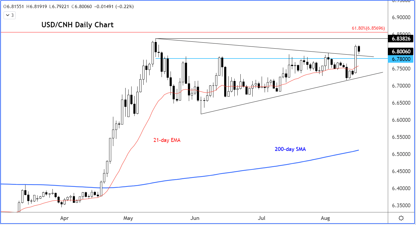 美元/离岸人民币打破了三角形盘整形态,后市或扩大涨幅。换言之,人民币可能扩大下行,继而利空澳元。关键支撑位在前阻力位6.7800-6.7900区域。