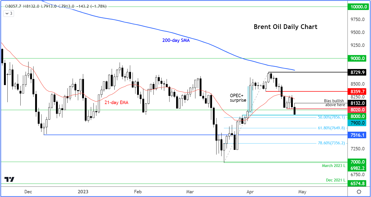 布伦特原油自3月底以来首次跌破80美元,而WTI原油也创下本月新低,跌至76美元以下。两种石油合约也终于回补了本月初欧佩克+同意大幅削减石油产量后形成的缺口。随着补完缺口,石油能否卷土重来?我不会反向押注,即使对经济衰退的担忧正在上升。在等待技术反转信号确认的同时,我总体上是看涨原油前景的。
