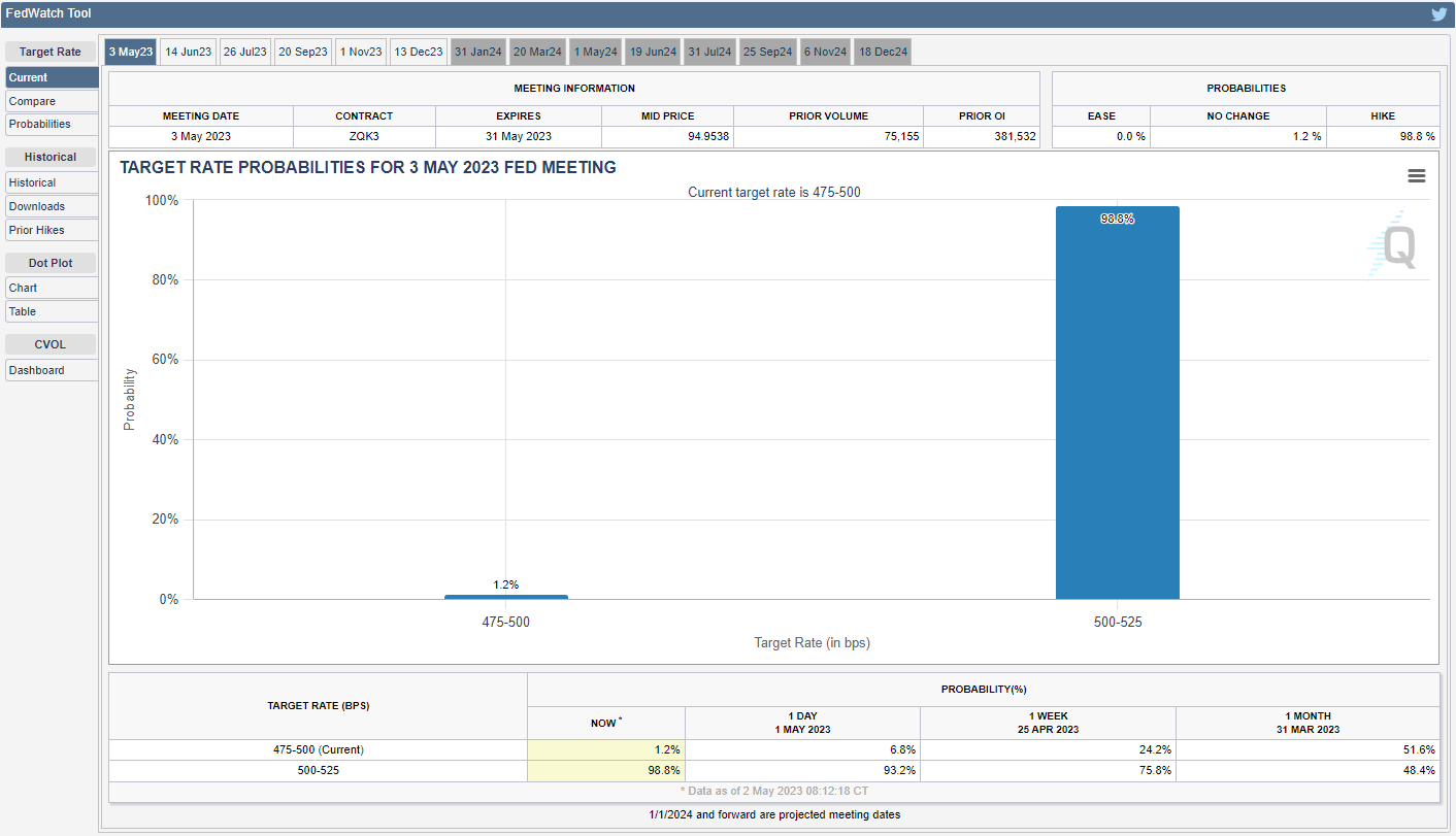 根据CME FedWatch Tool的数据,市场参与者预计联邦公开市场委员会(FOMC)将美国利率上调至新区间5.00%至5.25%的可能性大于90%,而加息25个基点加上鹰派前瞻性指引可能会拖累欧元/美元,因为主席杰罗姆·鲍威尔及其同僚保留了采取更严格政策的选项。