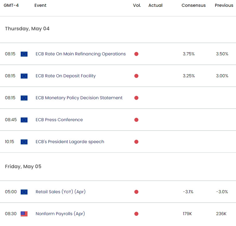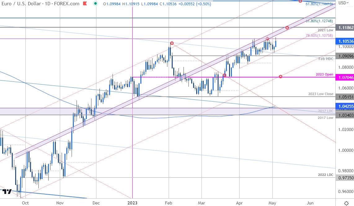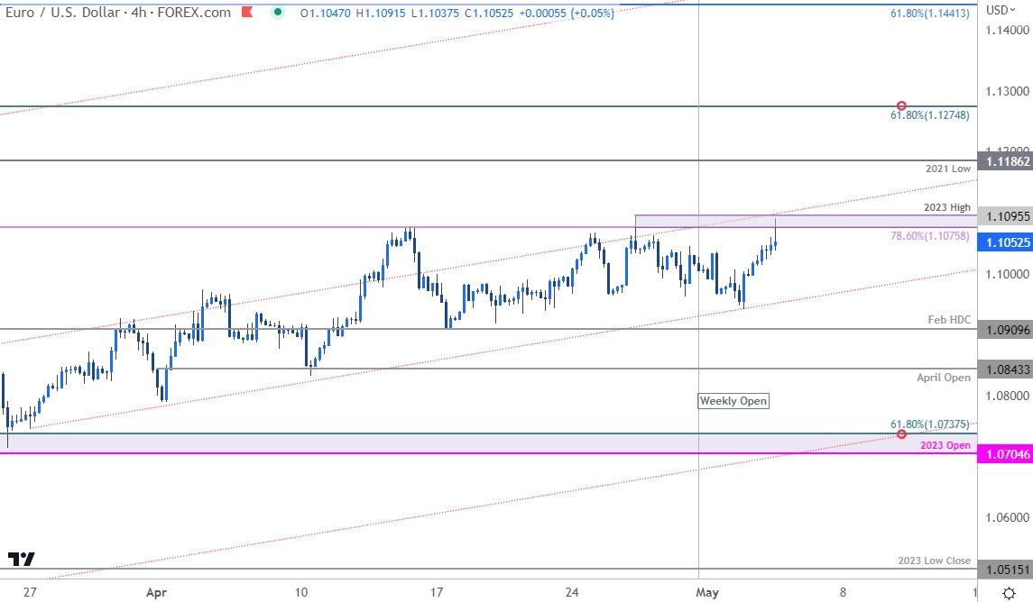 注意:仔细观察欧元价格走势,欧元/美元继续试探上升趋势阻力线,同时自3月下旬的波段低点连线形成的其平行线托住了随后的每一次回调。沿着该斜线(目前~1.0960+)寻找第一支撑位,随后又是支撑位1.0909和4月开盘价1.0843。关键支撑/看涨研判点位落在1.0705/37——该区域由2022年上升趋势线、本年开盘价和3月反弹的61.8%回撤位共同构成。