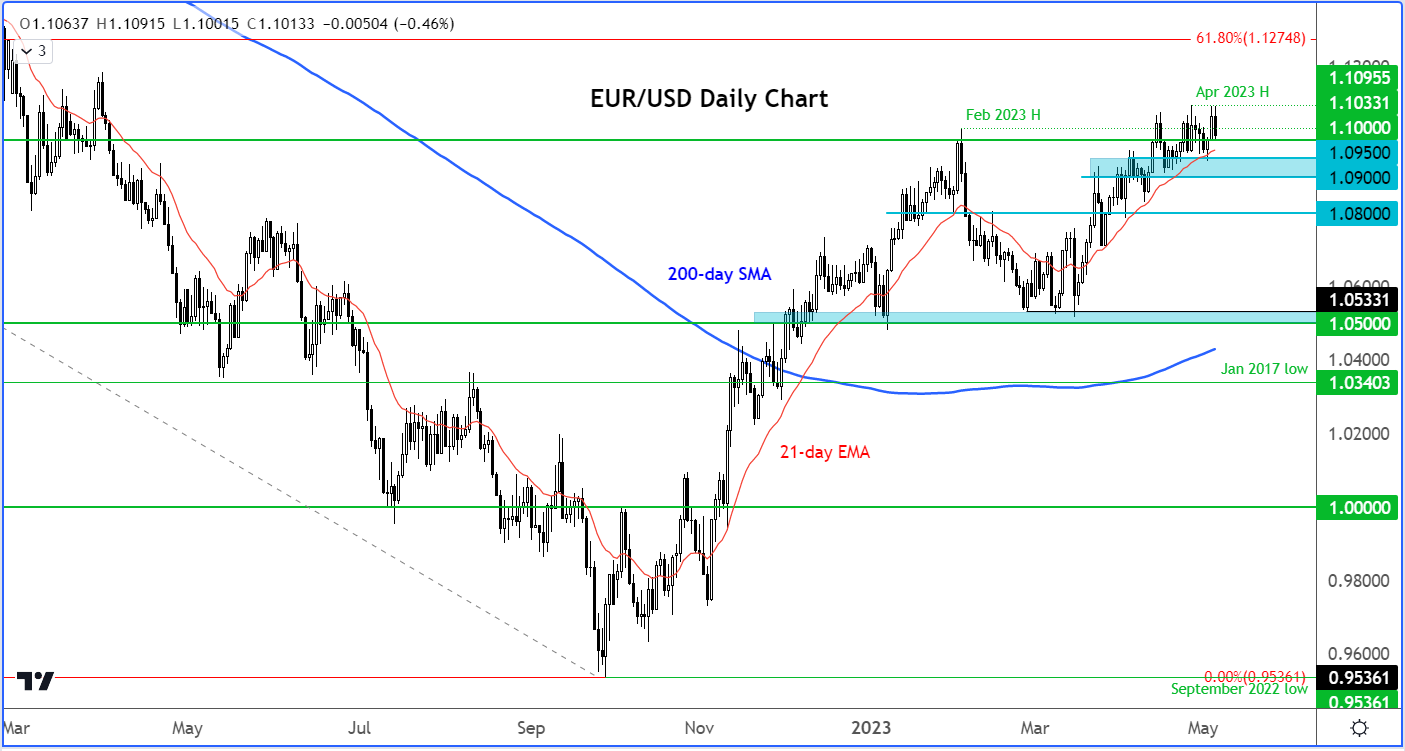 欧洲央行早前做出的措施完全符合预期,放缓货币政策紧缩步伐后,欧元/美元立即下跌约50点。与前一日的美联储相比,欧洲央行加息25个基点,将利率上调至3.25%,此前欧洲已连续三次加息50个基点。不过抛压整体较为温和,欧元/美元价格在1.10关键关口附近徘徊,但由于欧洲央行行长拉加德早前发言中没有什么消息值得投资者兴奋,因此货币对价格仍保持在一年内高点附近。政策声明关键词如下:
