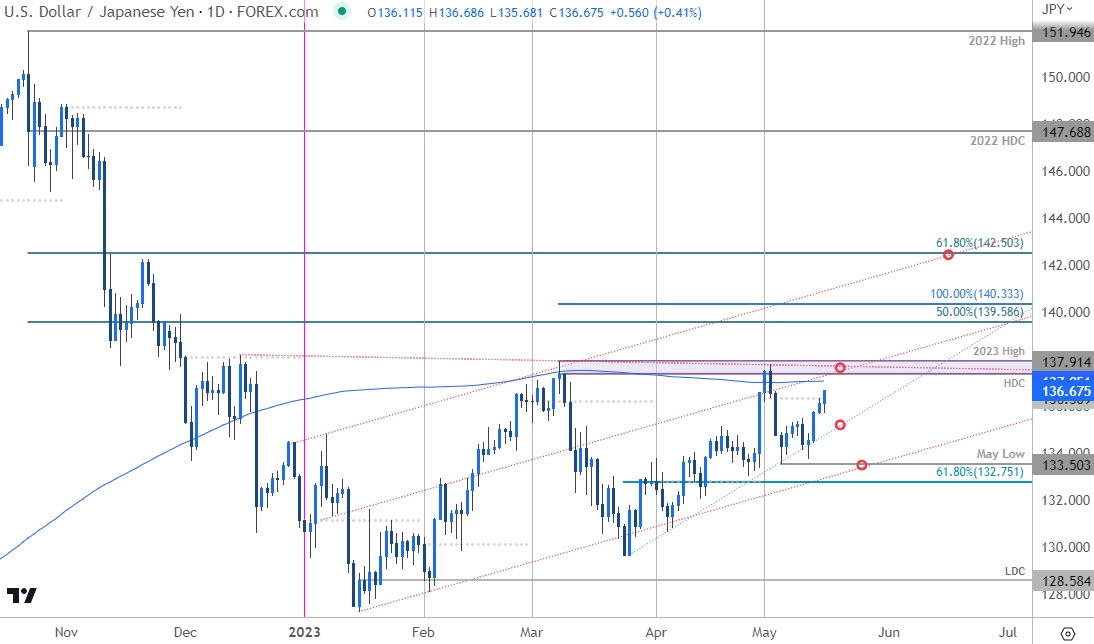 技术展望:在上个月的日元短期展望中,我们注意到美元/日元正在测试135附近的一个关键枢轴区域,“需要突破/收盘高于该关口才能推动下一轮上涨”。美元/日元在4月底走高,但反弹在关键阻力位137.36/90附近步履维艰——该区域由年线高点/日高收盘价构成,与12月高点延伸出来的基本趋势阻力线交汇。