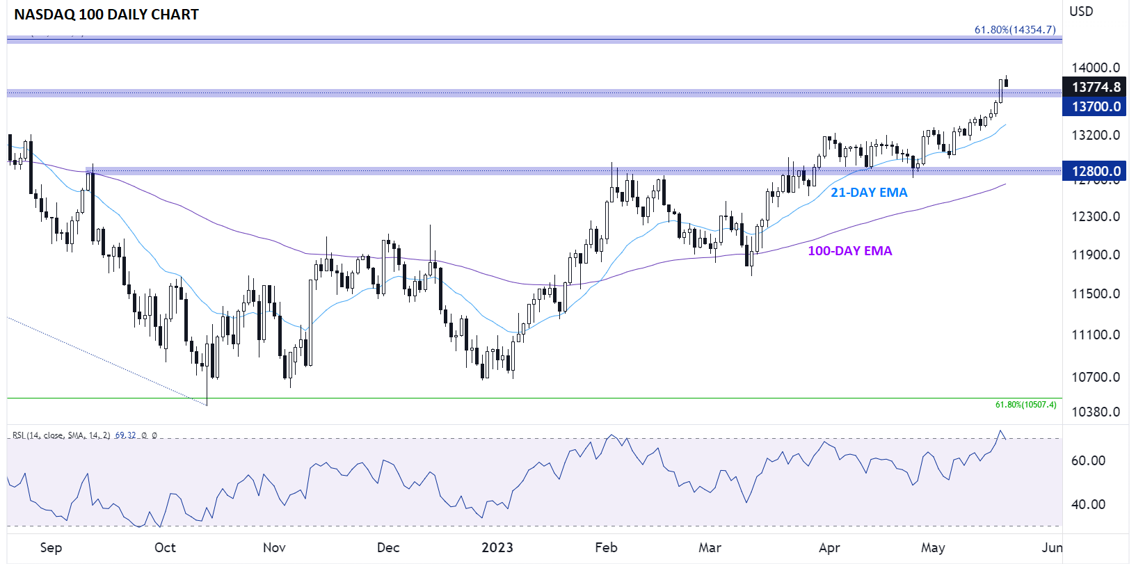- 纳斯达克100指数受益于表现抢眼的财报季,而现在,市场对潜在的债务上限协议持乐观态度。