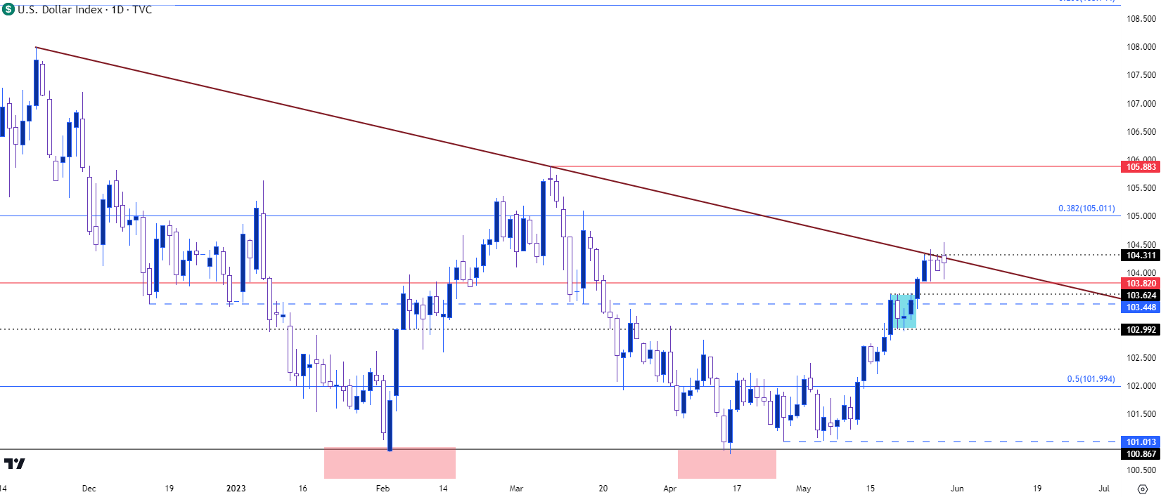 也许在某种程度上,这种情况已经发生,但到目前为止,多头的支撑位高于先前的阻力位,这为涨势延续打开了空间。至于DXY的支撑位,我将关注关键点位103.82,但它太近了,因此也算上了附近103.62和103.45作为几个额外的点位。103.00也很关键,因为这是上周DXY在日线图上建立晨星形态的支撑位。