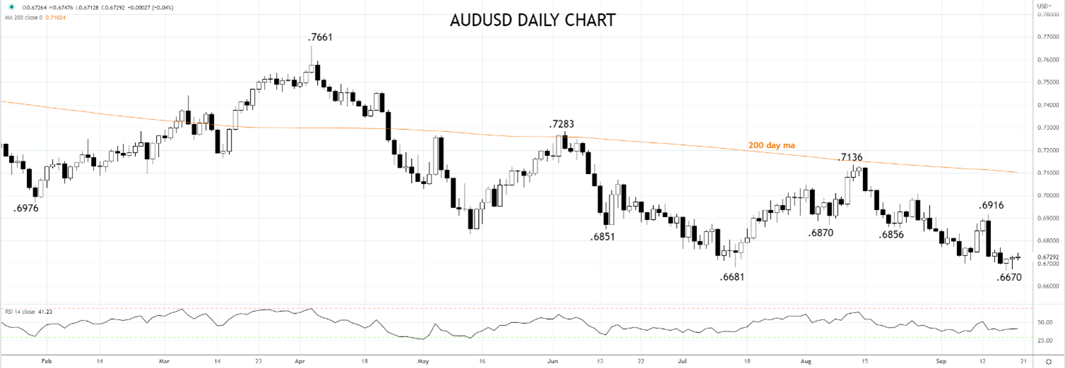 澳元/美元的关键枢轴/支撑位仍落在0.6680/60,如果在该位下方持续下挫,或打开下探0.6500/6300区域的空间。