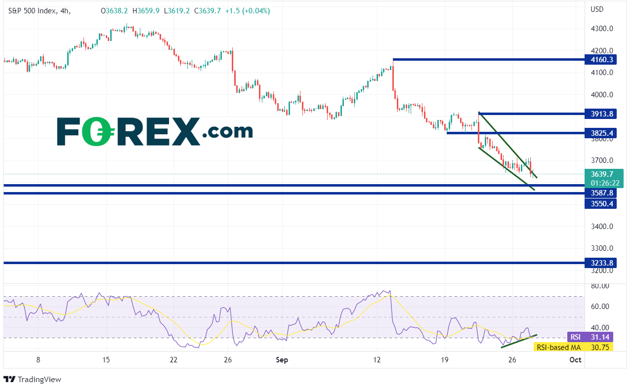 从当前走势打破了下降楔形判断,股市应可反弹。请注意,4小时图RSI正与价格背离。如果价格确实自当前价位回升,则上方阻力先后有水平阻力位3825.4、下降楔形的100%回档位兼9月21日高点3913.8、9月13日以来高点4160.3。但如果价格继续下跌,则下方支撑位有2020年9月高点3587.8、2020年10月以来高点3550.4、2020年11月低点3233.8附近。