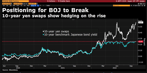以上图表由彭博社的Valerie Tytel分享。她警告称,收益率曲线控制(YCC)失效是“不能忽视的可能性”。这是因为10年期日元互换已经开始显著上升,超过10年期日本国债收益率0.25%的门槛。这表明投资者正通过做空日本国债来对冲他们的押注,因为他们担心YCC可能会被弃用。