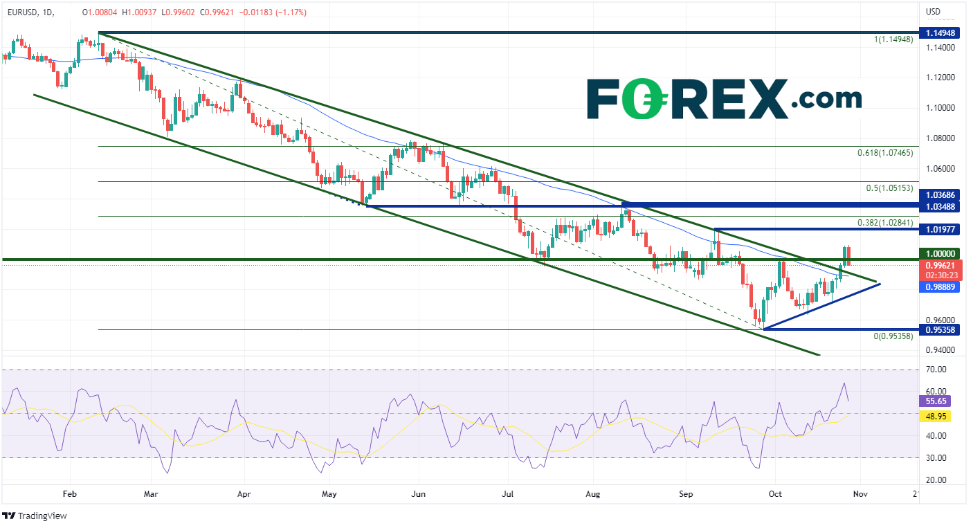 较低的利率拖累了欧元。欧元/美元自2月以来一直处于下行通道。然而,该货币对在周二走高并突破通道,随后自9月20日以来首次回到平价上方。由于交易员将今天欧洲央行的行动视为“鸽派加息”,欧元/美元从1.0080的高位跌落至0.9959的低位。(在我们发稿时,欧元/美元仍在创出日内新低)。日线图上的第一个支撑位是长期下行通道的上沿和50日移动平均线的交汇点0.9889附近。在此下方,支撑位于自9月28日低点以来形成的上行趋势线0.9770附近,然后是9月28日低点0.9536。如果守住了复合支撑位,那么第一个阻力位在9月12日的高点1.0198,然后是从2月10日的高点到9月28日的低点区间的38.2%斐波纳契回撤位1.0284。在此上方,价格可能升到1.0349至1.0369之间的阻力区域。